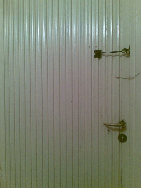 Vasemmalla WC:n ovi, oikealla kynttilänjalkana toiminut pullo WC:n lattialla.